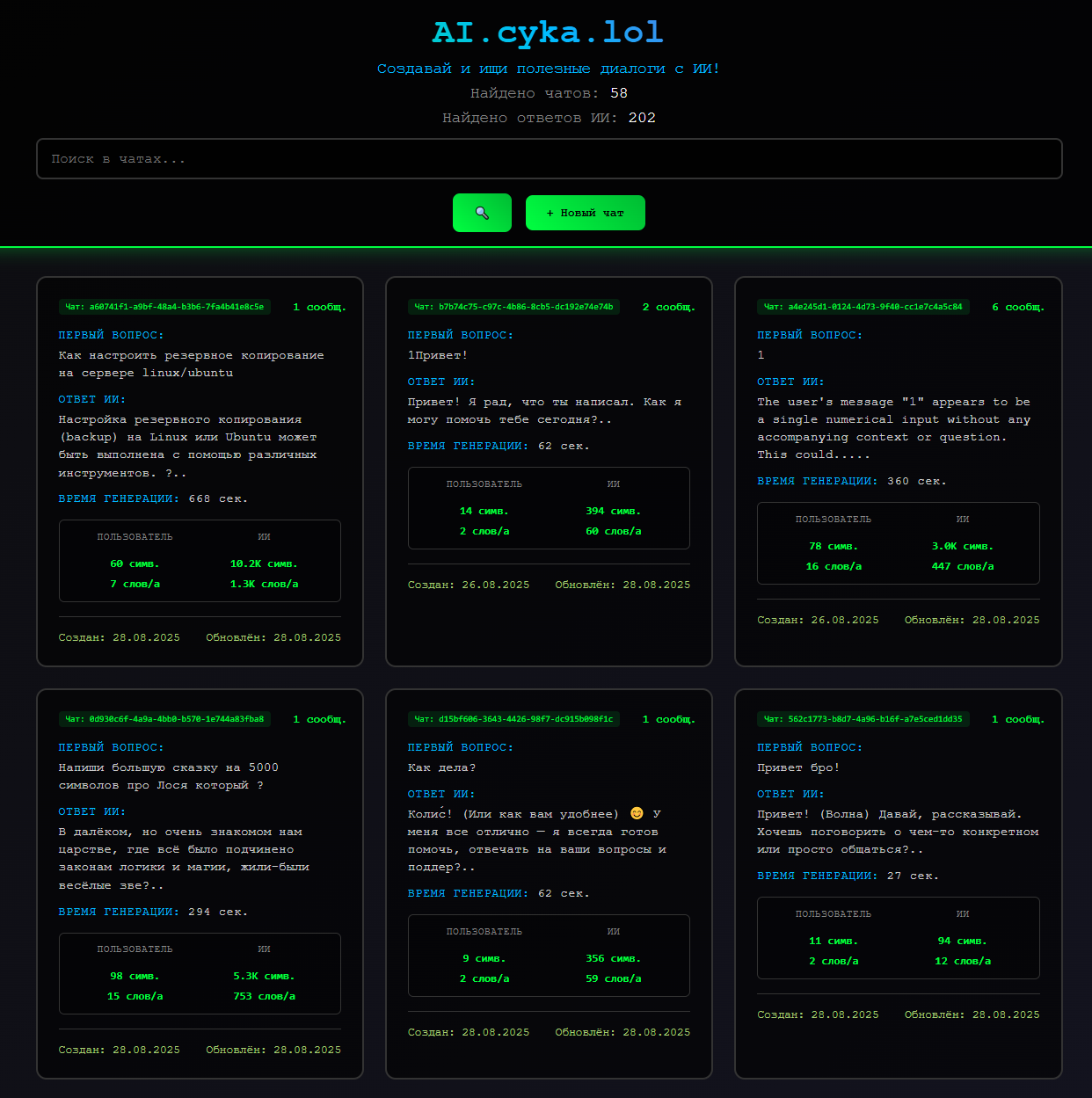Сегодня добавил на главную страничку ai.cyka.lol все чаты и возможность поиска по ним, из поиска можно перейти непосредственно в диалог и далее продолжить уже в контексте этого диалога общение.